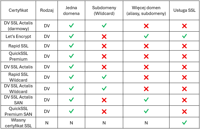 Porównanie wszystkich certyfikatów SSL dostępnych w naszej ofercie - włączając w to certyfikaty darmowe.